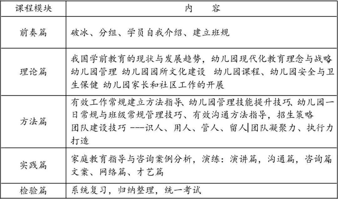 职业园长、幼儿园的文化建设、幼儿园组织的经营与管理、婴幼园管理平台的组织优化与建设、幼儿园园长的专业发展、幼儿园园长的职责和素养、幼儿园教师队伍的培训与管理、幼儿园家长和社区工作、学期教育政策和法规的落实。