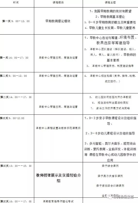 授课内容主要为:0~6岁早期教育的概念及其重要性、我国早期教育的现状和展望、早教儿童生长发育、早教儿童营养、早期教育基本理论、早教师的基本素质、早期教育的先进理念及其运用、0~3岁亲子早教课程设计及组织指导、3~6岁幼儿园课程设计及组织指导、早期教育管理应用及早教基地筹建与运营等。授课内容注重实际操作能力的培养,方法更先进、知识更全面。